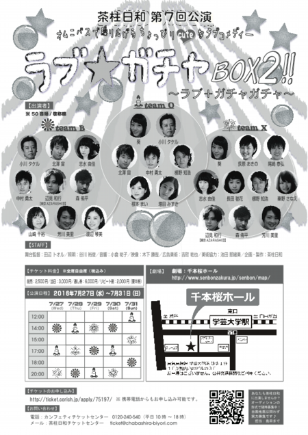 舞台監督:田辺 トオル/照明:谷川 裕俊/音響:小倉 祐子/映像:木下 勝哉/広告美術:吉町 祐也/美術協力:池田 那緒美/企画・製作:茶柱日和